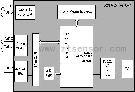 為驗證智能薄膜壓力變送器的功能及性能指標,必須設計一主控制器和多個變送器進行單向(必要時增加雙向)CAN總線通訊,并將4-20mA模擬量轉換為數字量,將每個變送器節點的壓力值顯示出來。這個主控制器必須具備CAN總線通信、模數轉換、壓力值顯示、能與PC通信等功能。為方便現場調試,這個控制器必須體積小、攜帶方便的特點。